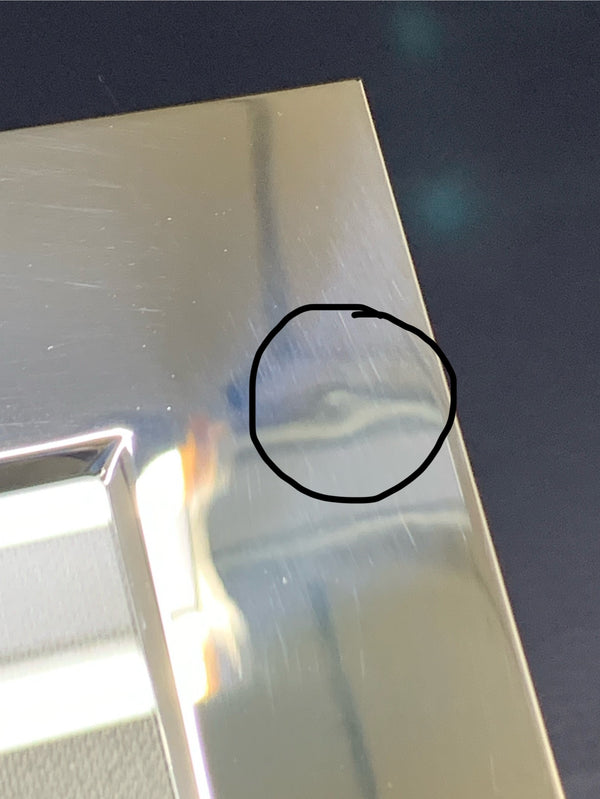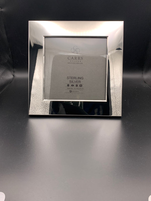 Slight second sterling silver photo frame on a velvet back - Metal dented. Highlighted in the image.All Carrs sterling silver frames bear a British Hallmark. This guarantees it has been independently tested by the Sheffield Assay office.Designed and manufactured by Carrs Silver, Sheffield England.Care: To prevent tarnishing, clean product regularly with an impregnated polishing cloth.